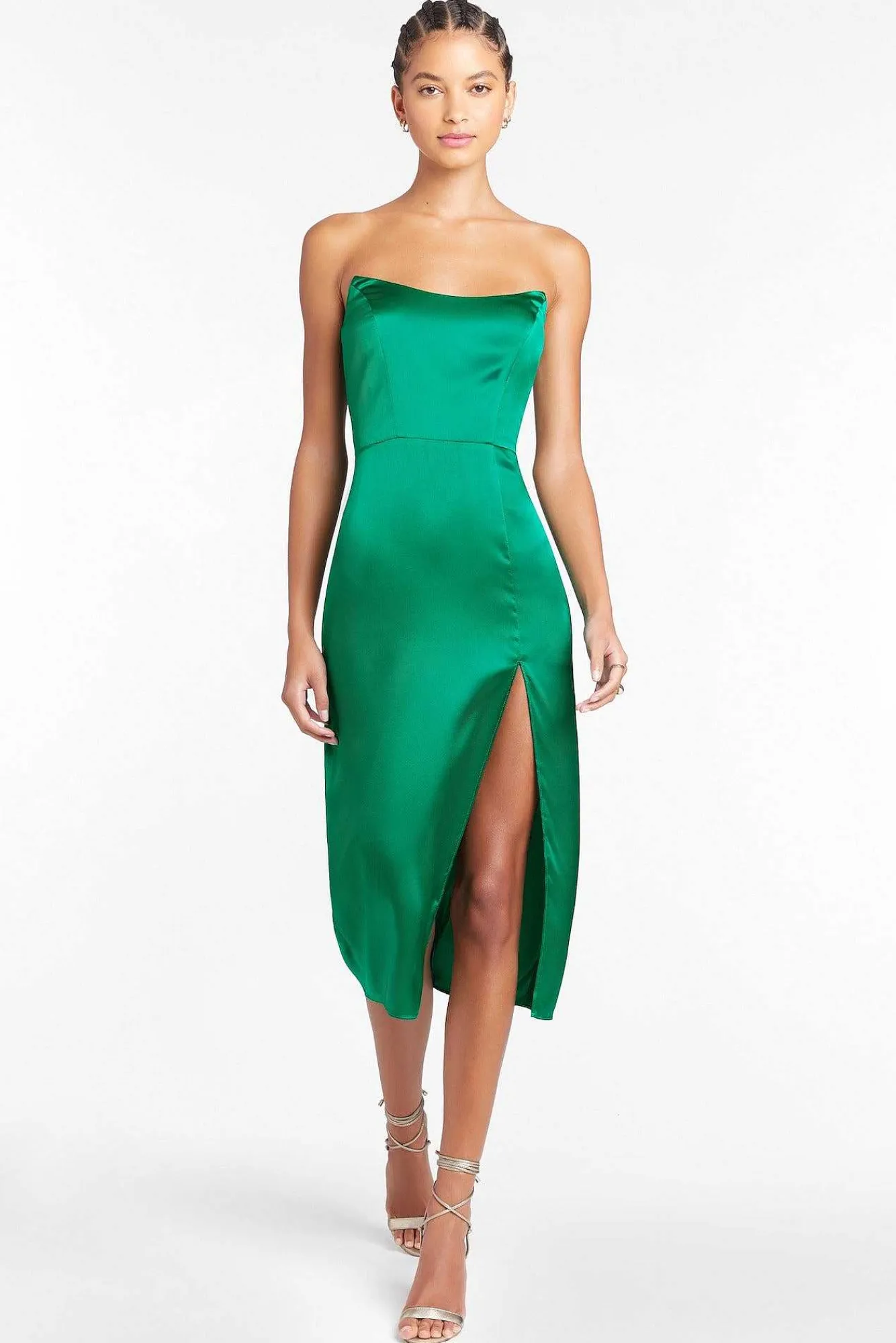 DescriptionMidi Dress Strapless Pointed Neckline Side Front Slit Invisible Zipper Unlined100% Silk Dry Clean Only Sc-222…