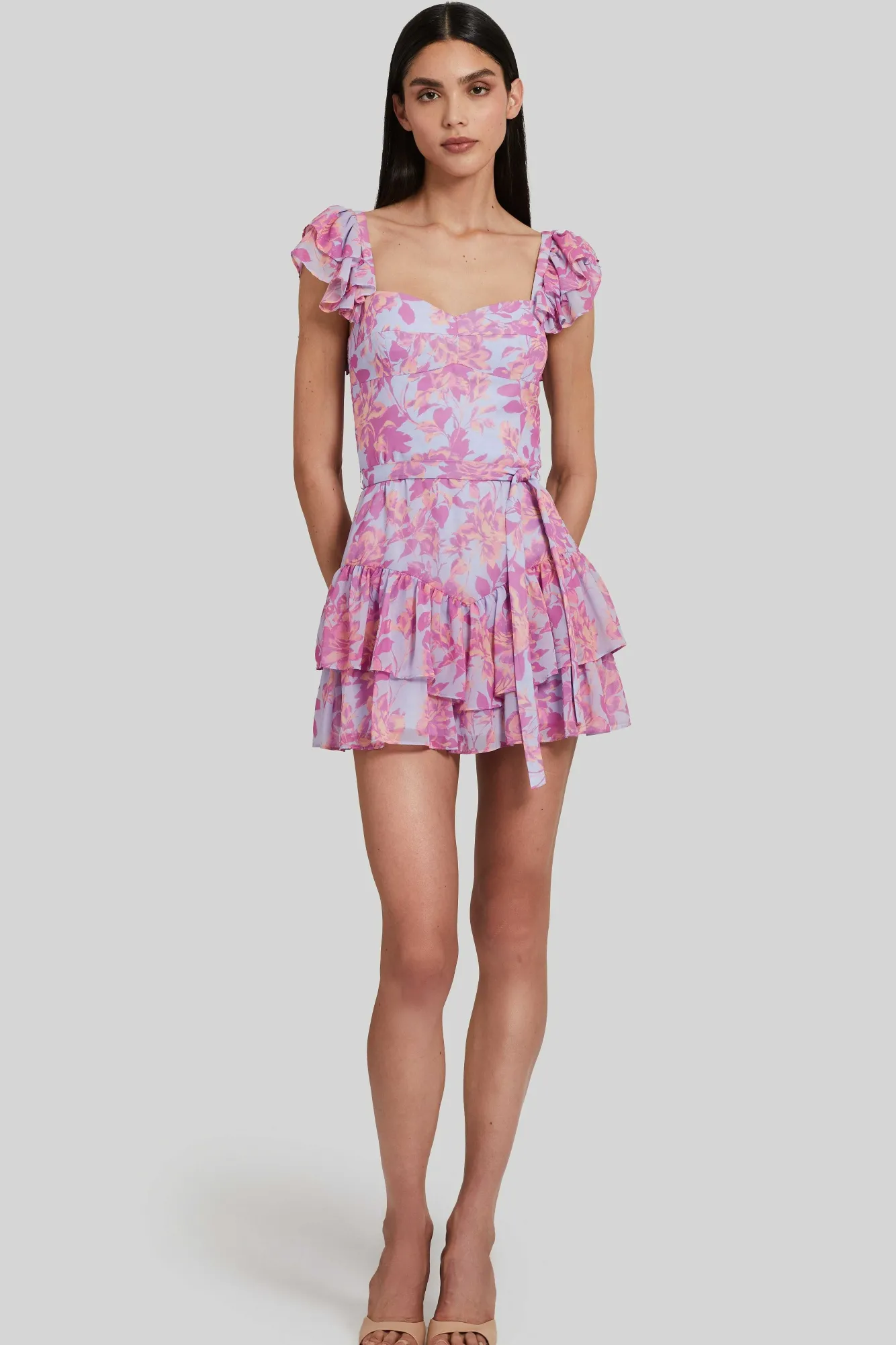 DescriptionRomper Sleeveless Sweetheart Neckline Fitted Bodice Ruffle DetailTie Belt Detail Fully Lined Self: 100% Polye…