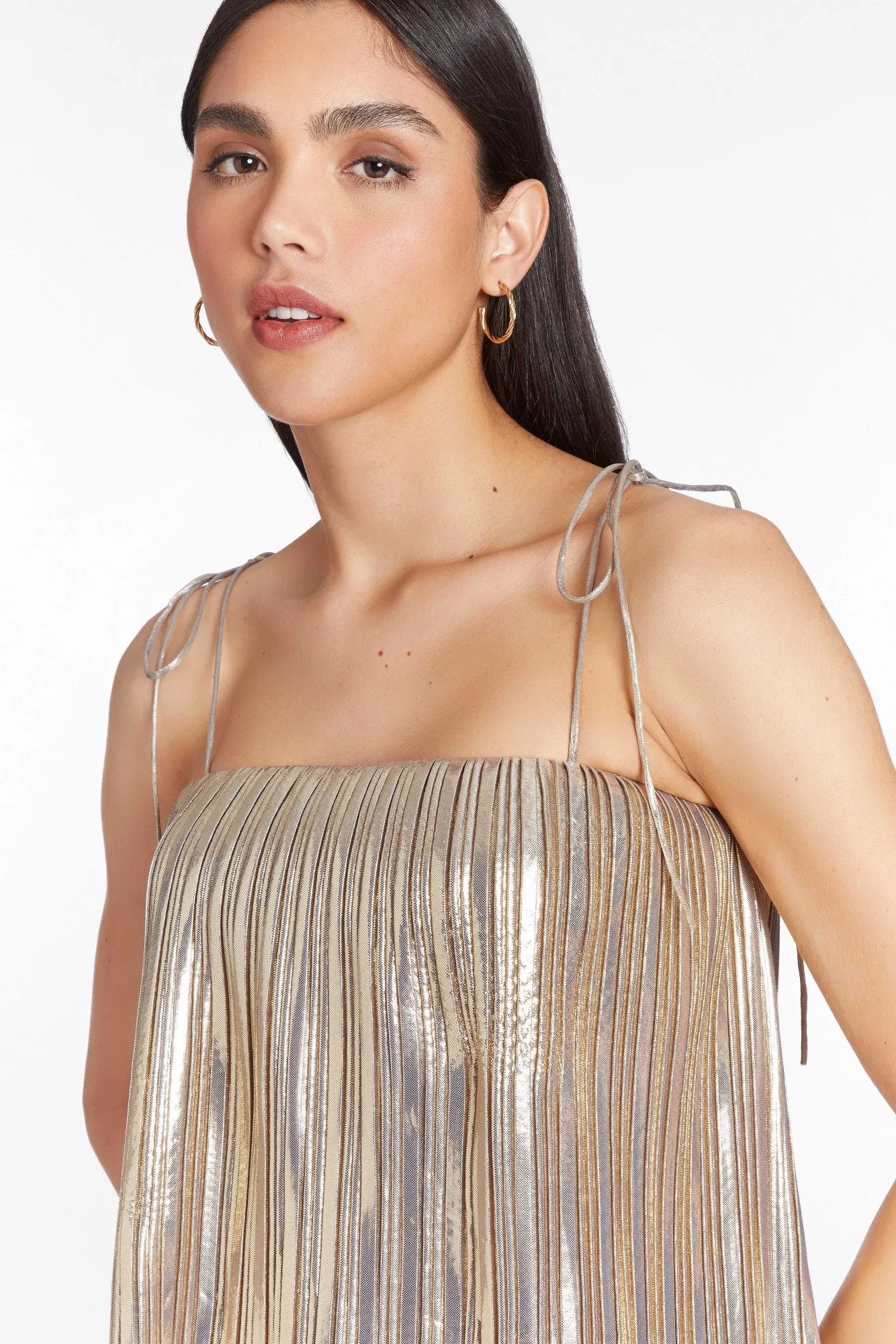 DescriptionTop Straight Neck With Pleated Bodice Overlay DetailSpaghetti Tie-StrapsFully Lined Self: 100% Polyester Lini…