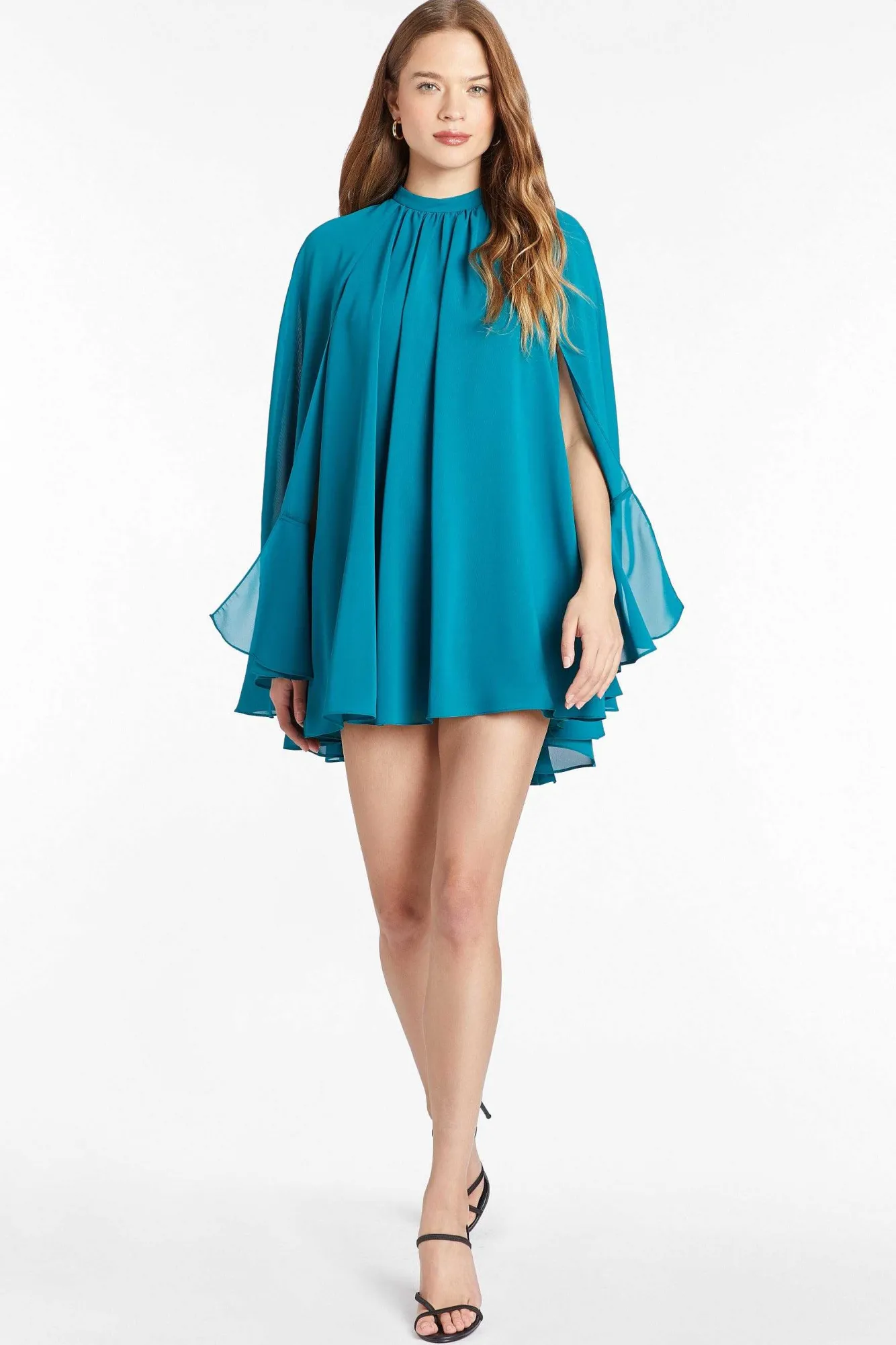 DescriptionMini Cape Dress Mock NeckFlutter Cape Fully Lined Self: 100% Polyester Lining: 95% Polyester 5% Elastane Dry …
