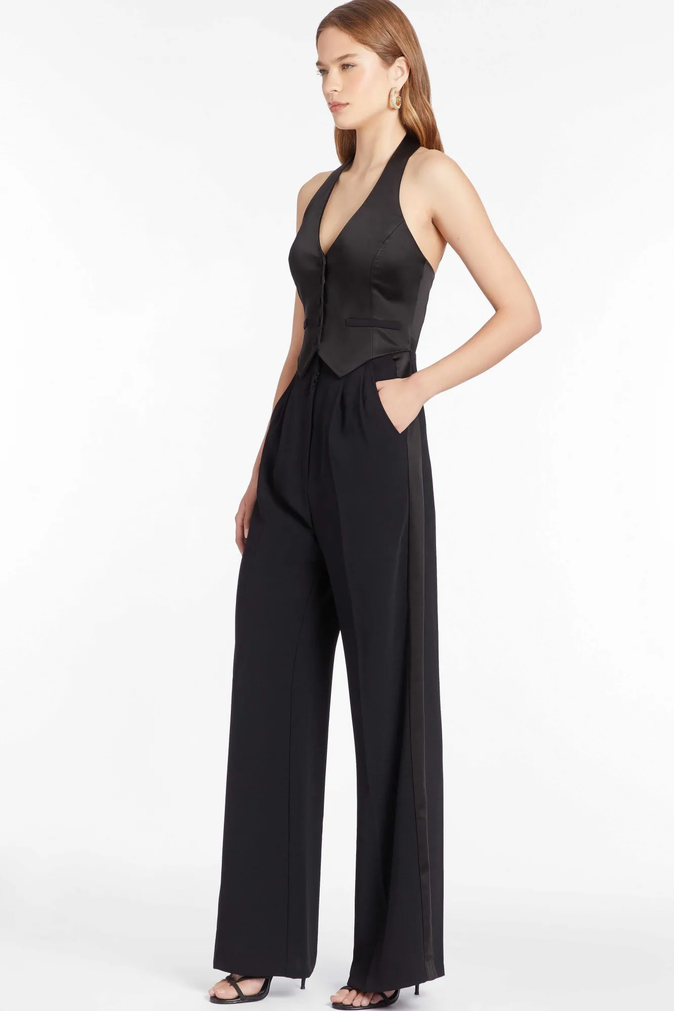 DescriptionVest Style Jumpsuit Satin-ComboWelt PocketsPartially Lined Self: 100% Polyester Combo: 65% Acetate 32% Nylon …