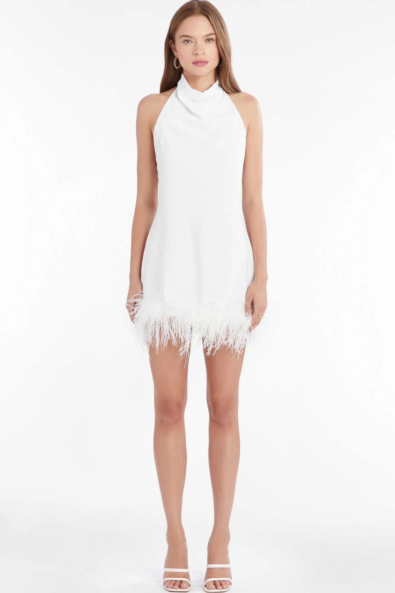 DescriptionMini DressSleeveless Mock Neck Open BackFeather Hem Wash Cold, Hang Dry 100% PolyesterCi-21749