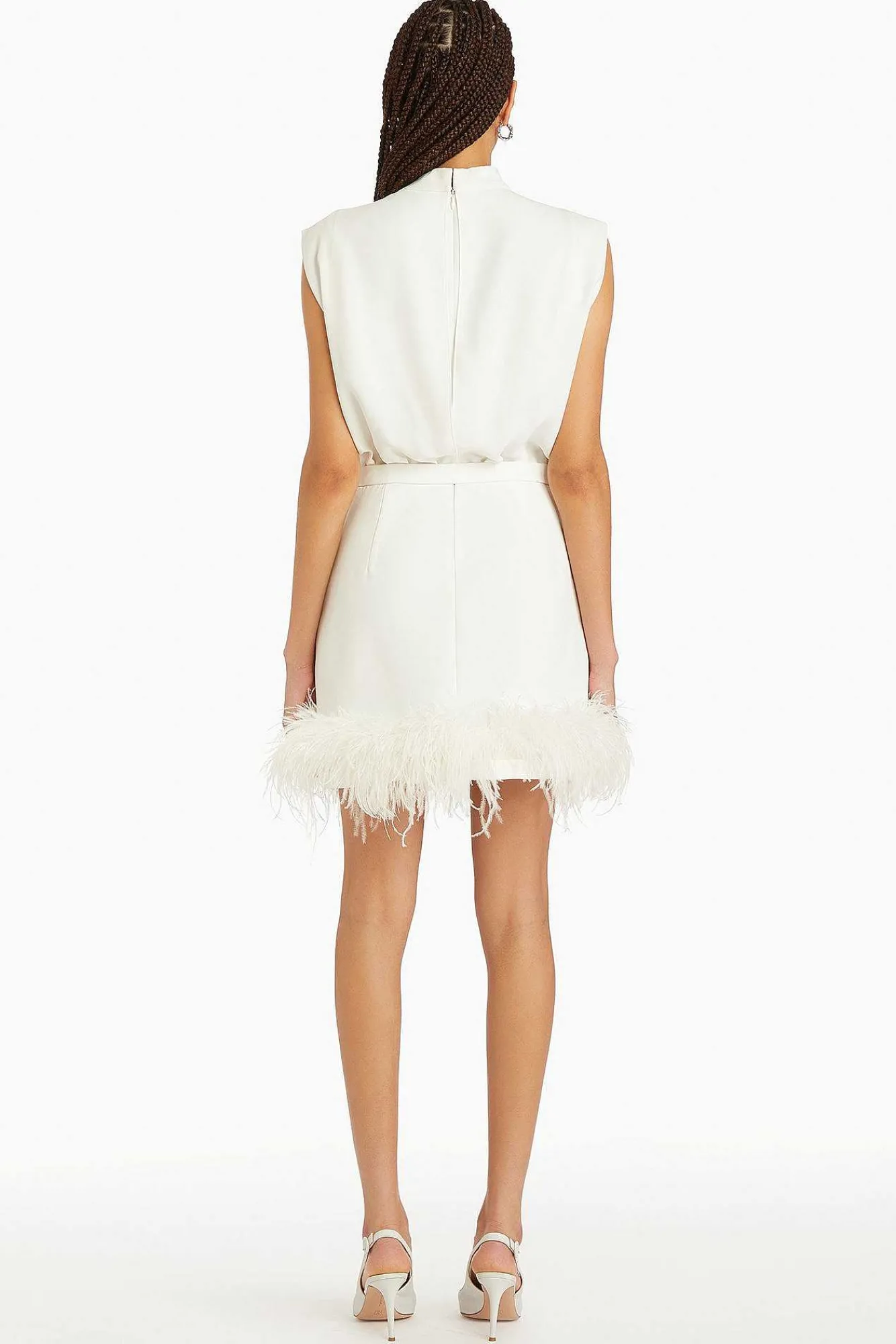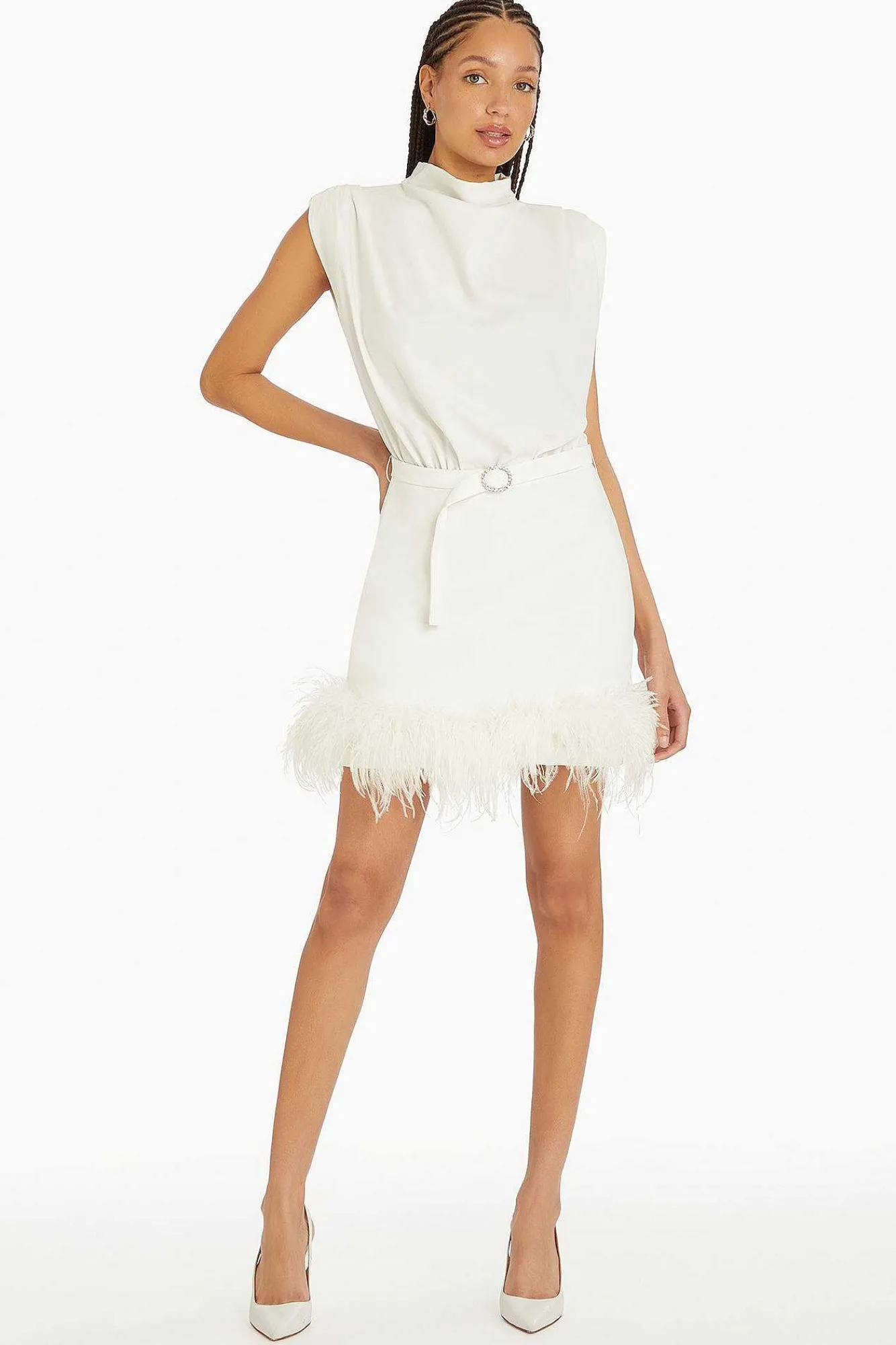 DescriptionMini Dress Sleeveless Mock NeckSelf Buckle With Novelty Rhinestones Feather Hem Fully Lined Self: 100% Polyes…